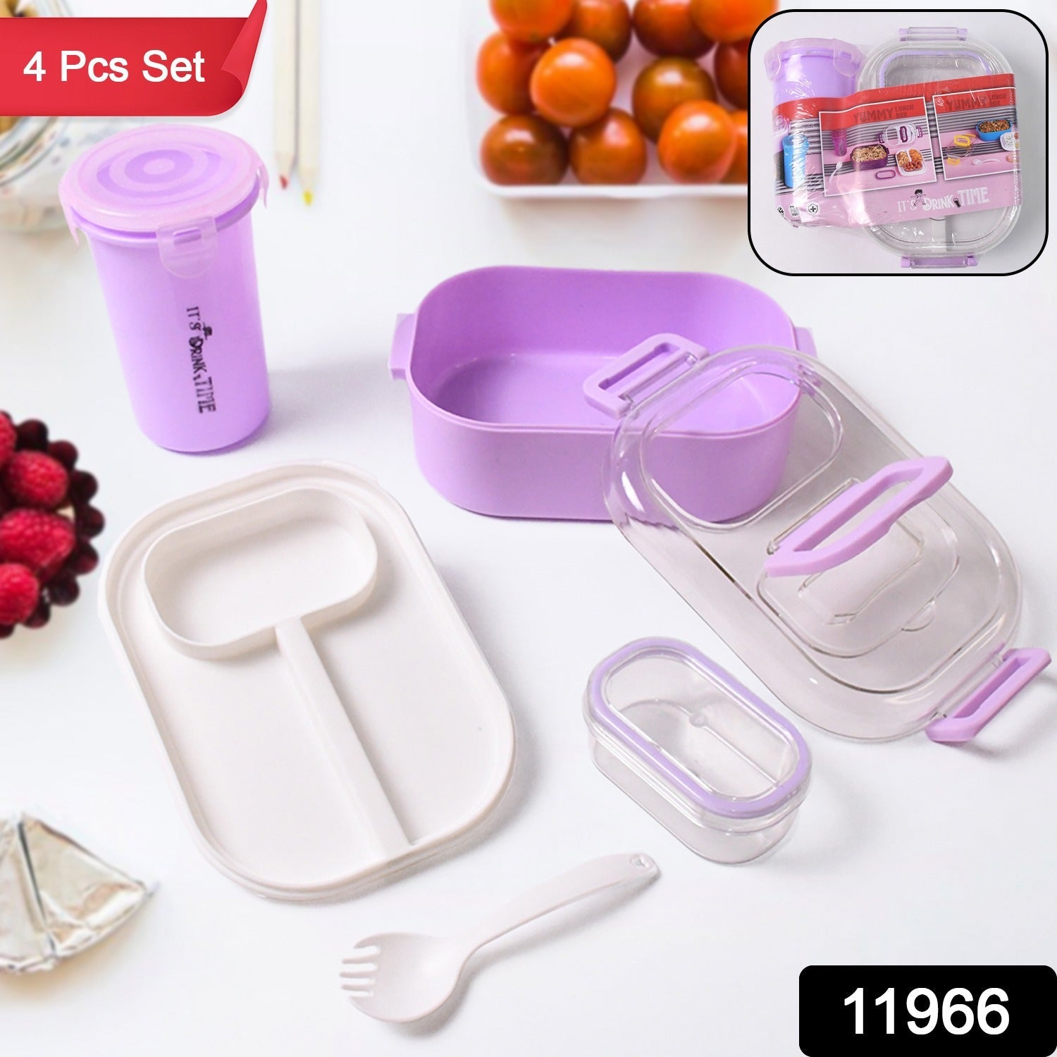 Plastic Lunch Box With Small Box, Bottle & Sponn - Plastic Reusable Food Containers Tiffin Box for Boys / Girls / School / Office (4 Pc Set)