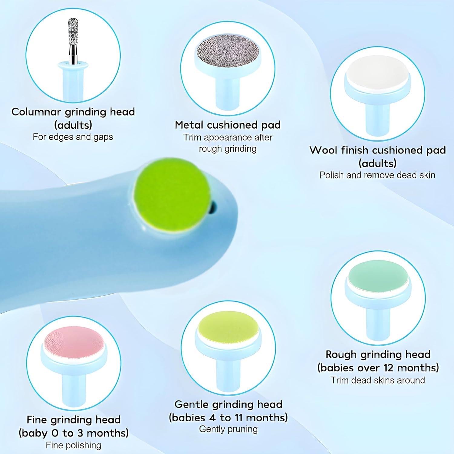 - Interchangeable Nail Pads For Different Ages :- For Baby/Kid (1) Rough Grinding Head : 0–3 Months Soft Type (2) Fine Grinding Head : 4–11 Months Medium Type (3) Super Fine Grinding Head : 12 Months And Up Hard Type.