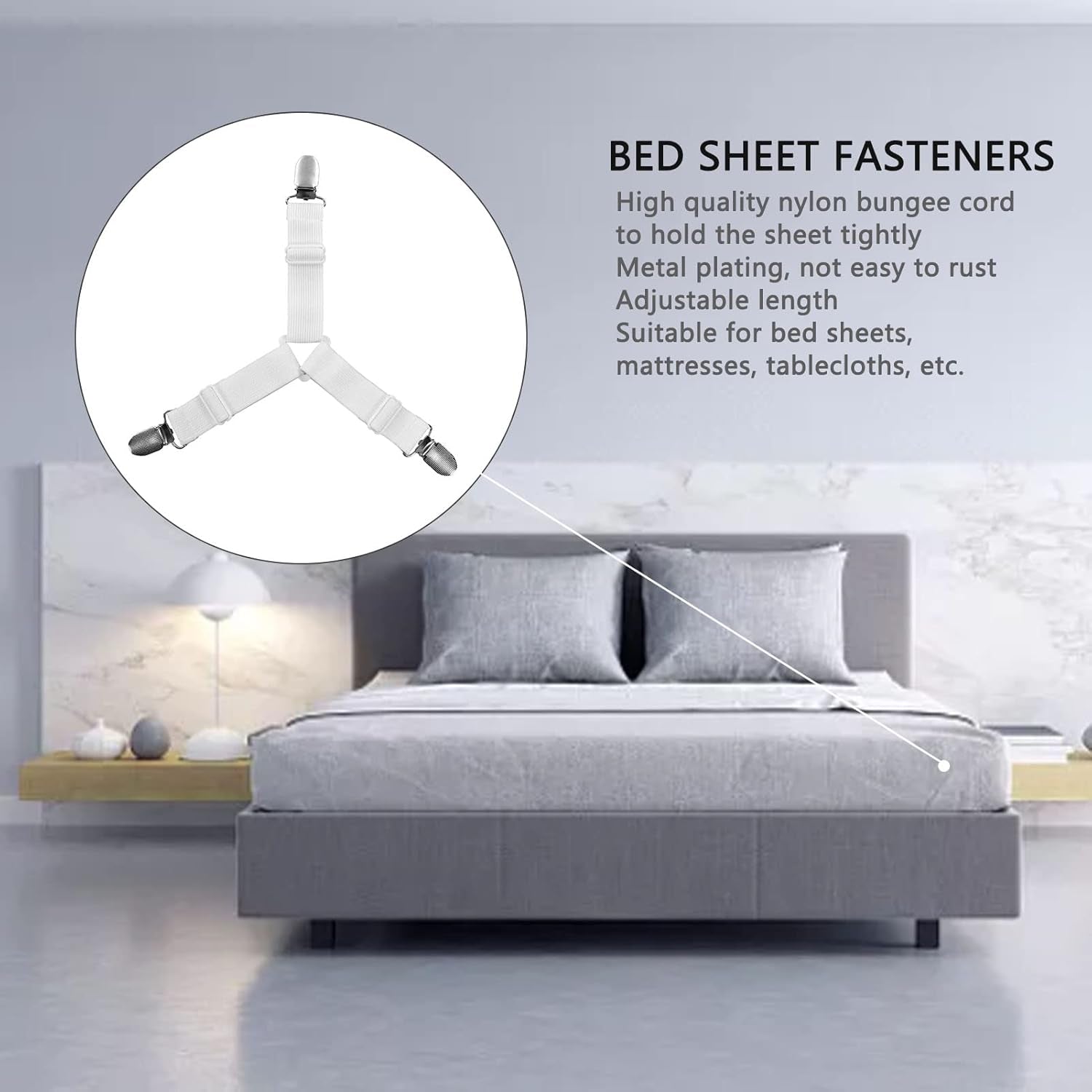 HIGH QUALITY MATERIAL: This Bed Sheet Fasteners are made of sturdy chrome metal clips and heavy duty elastic bungee cords that will grip your bed sheets firmly. Easy to put on and keeps sheets in place and no more fixing sheets, adjustable length allows desired tension. Triangle designs, which avoiding the elastic sliding all the time.